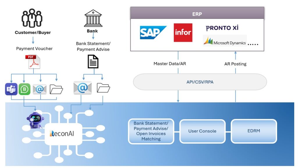 ReconAI is a ready-made Accounts Receivable AI Automation Solution that streamlines and manages the entire invoice-to-cash cycle, from generating invoices to final payment reconciliation. This digital transformation replaces manual, repetitive tasks with automated workflows, significantly reducing human error and improving efficiency. It also provides 5 key components such as Collection Capture through AI Capture, Payment Advise, Matching & Checking, Data library (EDRM), and an intuitive user console with security features.